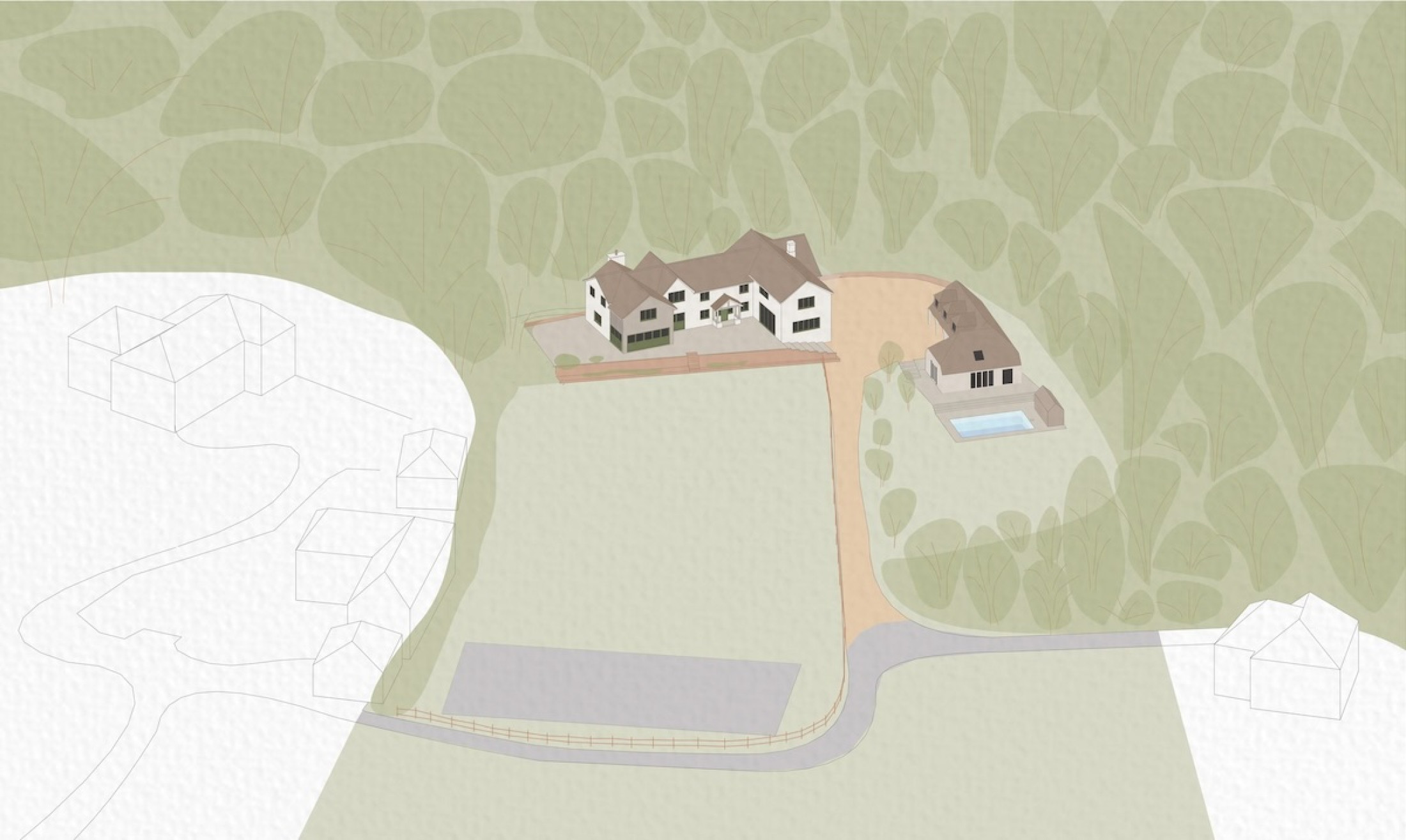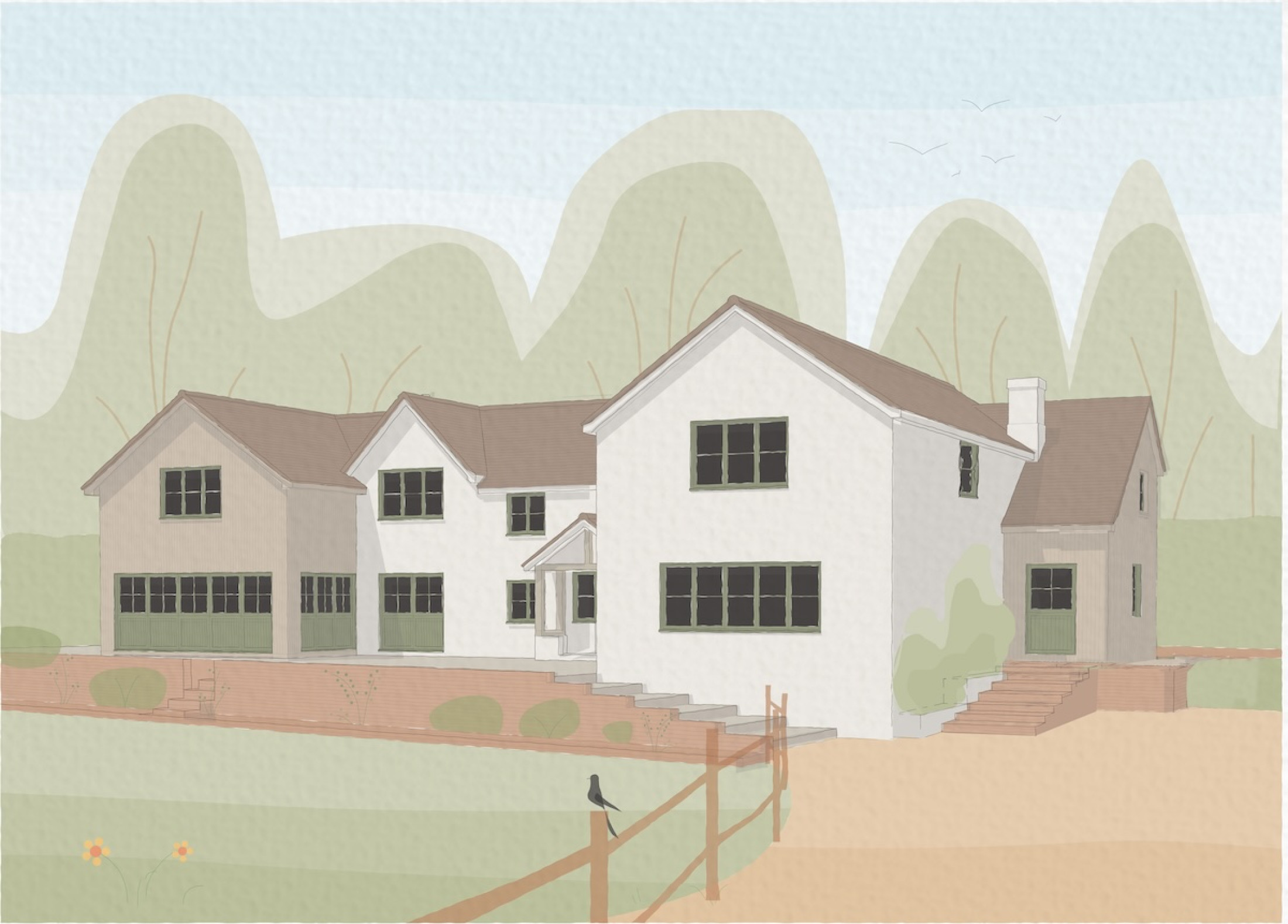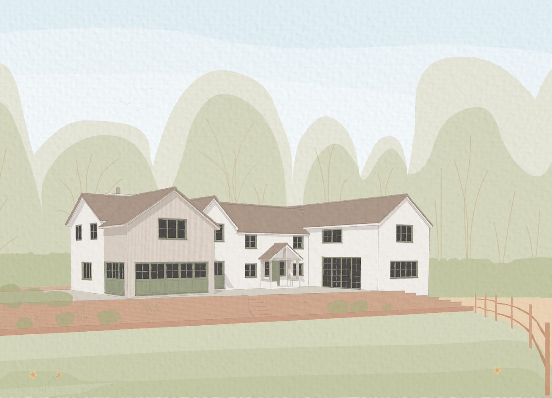 A substantial double height extension to the north and south elevation will add balance to the home, creating an enclosed inner courtyard and the internal space needed for the family to thrive. To soften the home into the landscape a subtle colour palette will be adopted, with timber cladding to break up the mass.