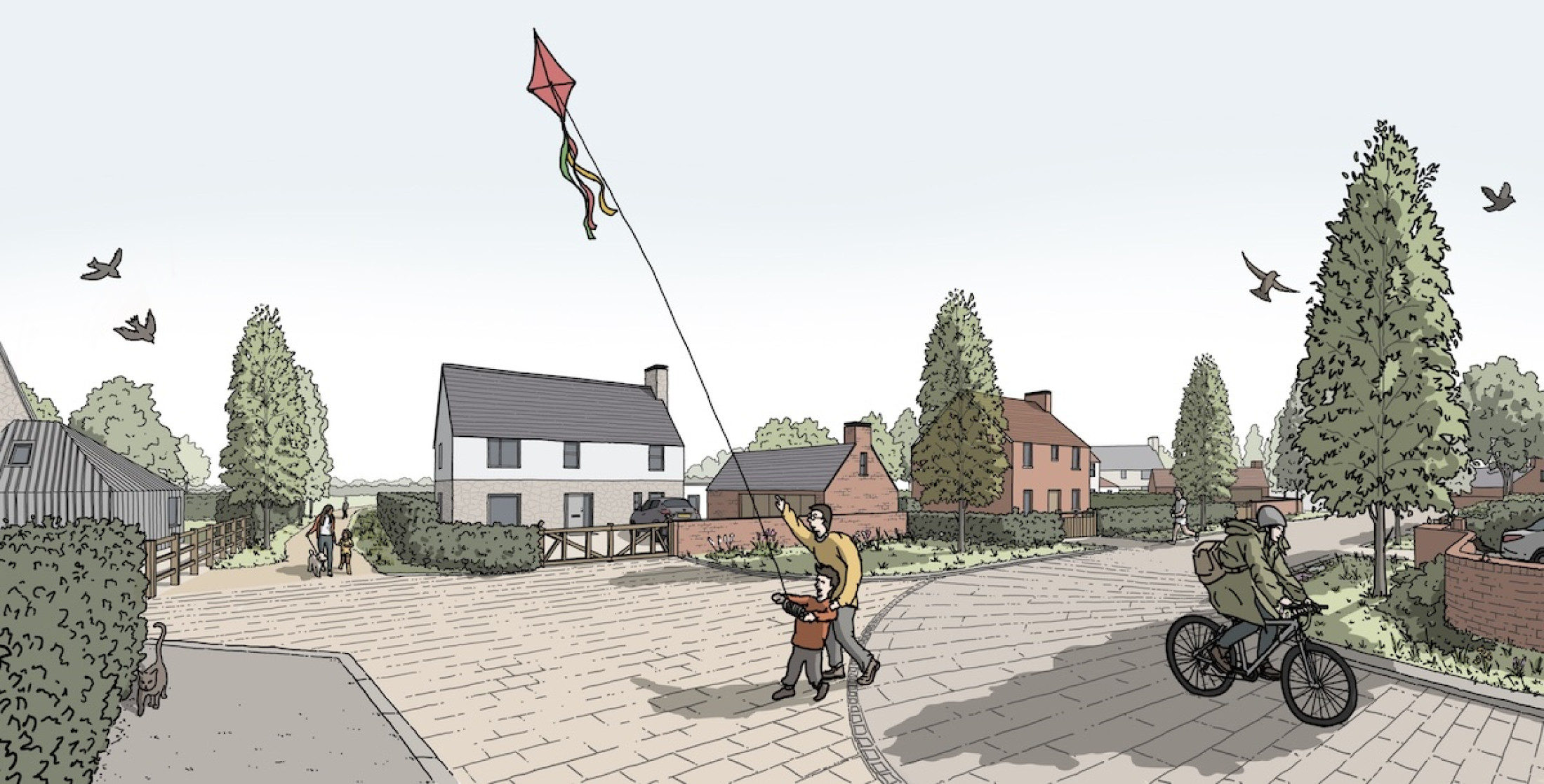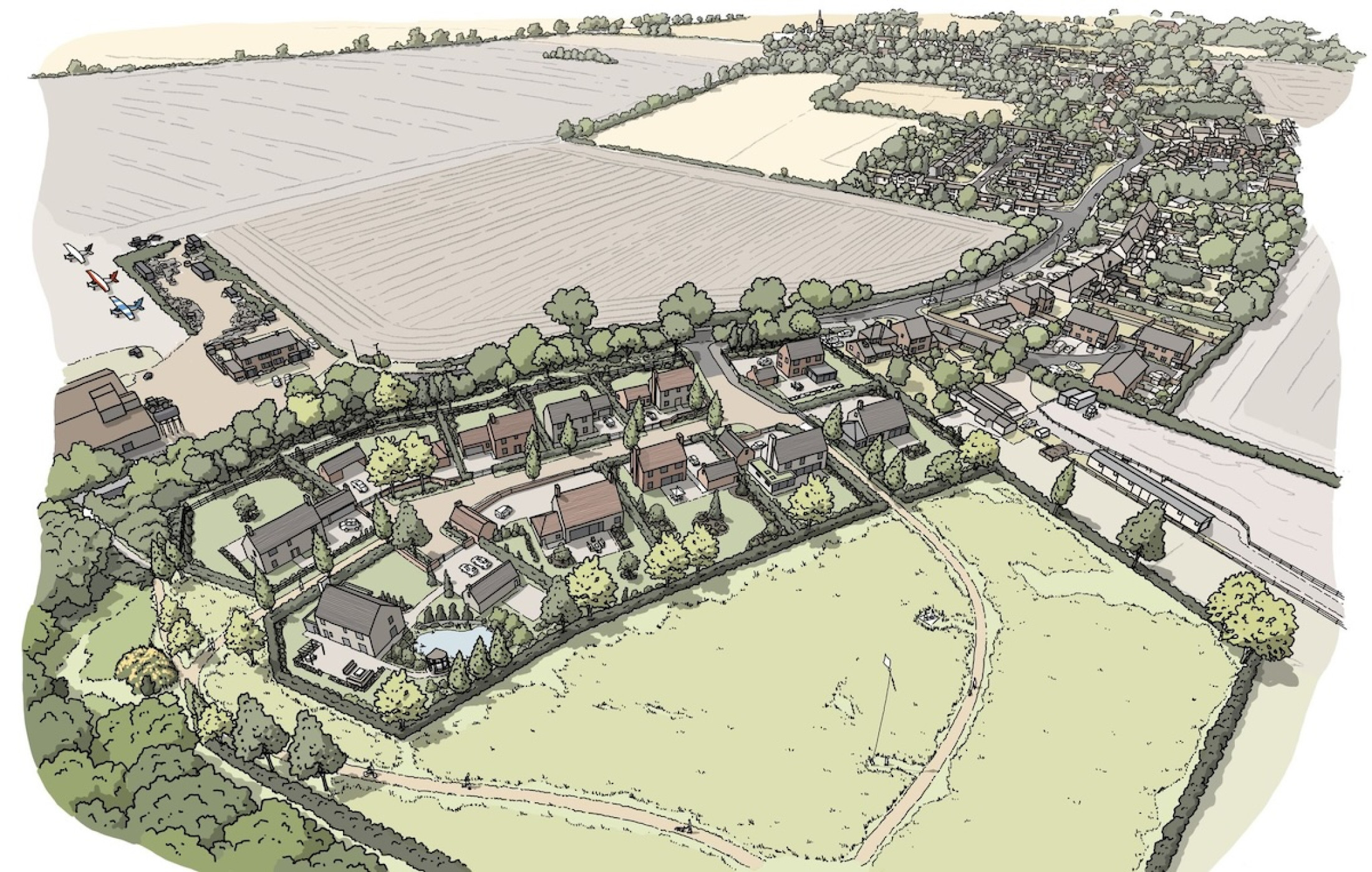 Our masterplan development for eleven detached houses in Oxfordshire is set on the edge of the existing village, designed to form an extension to the local vernacular settlement pattern.